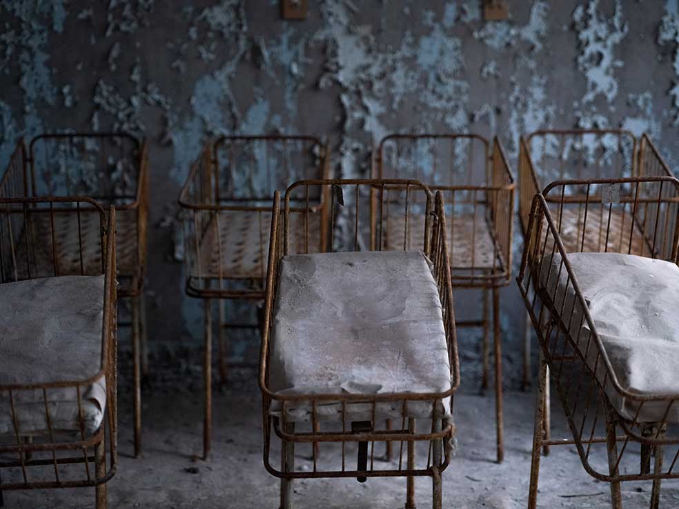 Nada se ha movido en 36 años en la ciudad fantasma. El hospital de Prípiat aún conserva sus 410 camas y las cunas de la maternidad, devoradas hoy por el moho, los hongos, el óxido... Cuando llueve, el agua entra en los edificios y se queda estancada en cualquier lugar, derrumbando los suelos, humedeciendo las paredes... convirtiendo todo, poco a poco, en ruinoso testimonio del imperio soviético.
