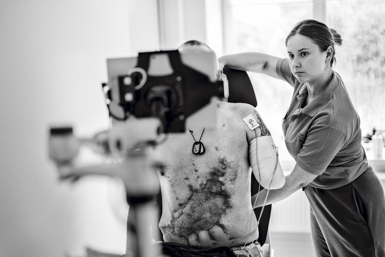 A poca distancia del dúo de veteranos, encontramos al doctor Danylo Turkevych, cirujano plástico y especialista en cirugía reconstructiva del hospital San Panteleimon, en Lviv. «Mi trabajo es evaluar las consecuencias de la amputación y, a partir de ahí, aplicar técnicas de reparación de nervios y vasos sanguíneos –comenta sin dejar de examinar una herida reciente en uno de sus pacientes–. Esto nos permite reconstruir partes dañadas o ausentes con tejido de los propios pacientes».