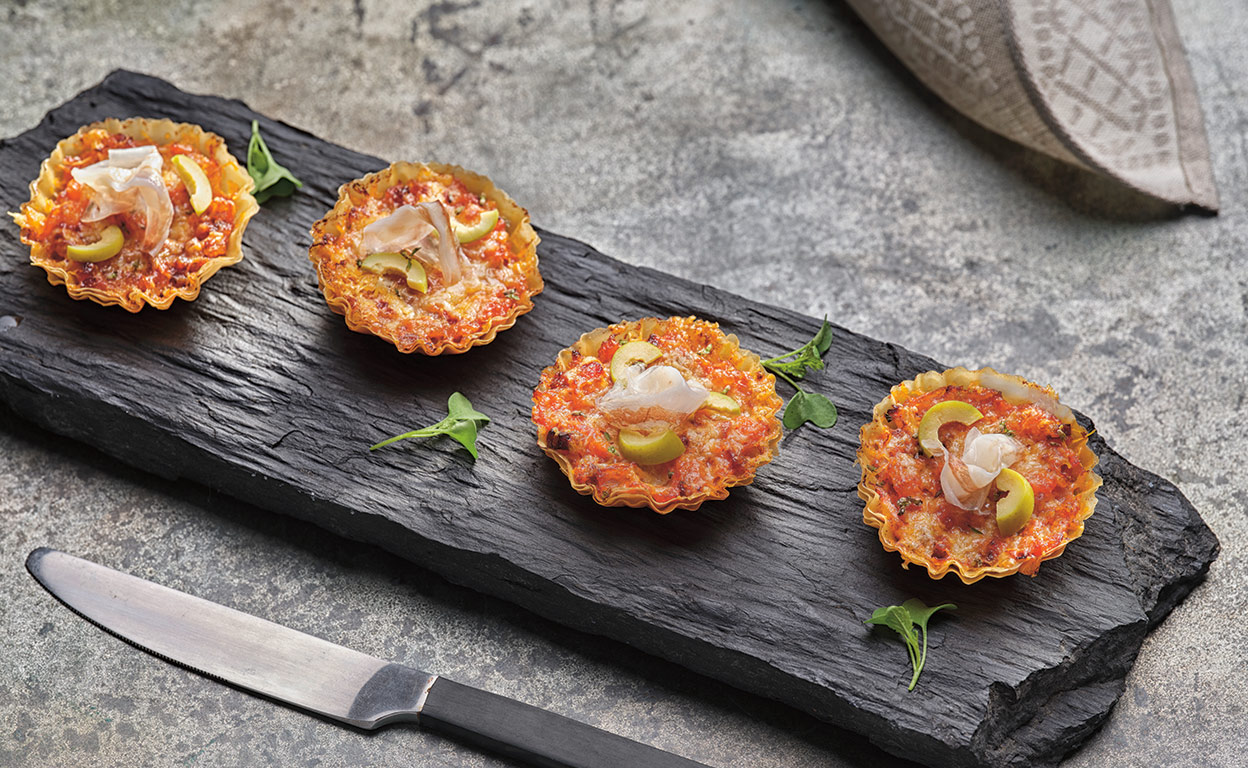 Suda la cebolleta con aceite de oliva y agrega el jamón, la pulpa de tomate y el tomate concentrado, dejando que se guisen para que se forme un sofrito sabroso y concentrado. Ojo con la sal: bastará con la sazón del jamón. Cuece 45 minutos y reserva. Mientras, precalienta el horno a 180 ºC. Derrite la mantequilla y, sobre una tabla o la encimera, estira una hoja de masa brick. Con un cortante realiza círculos y ve pintándola con la mantequilla.