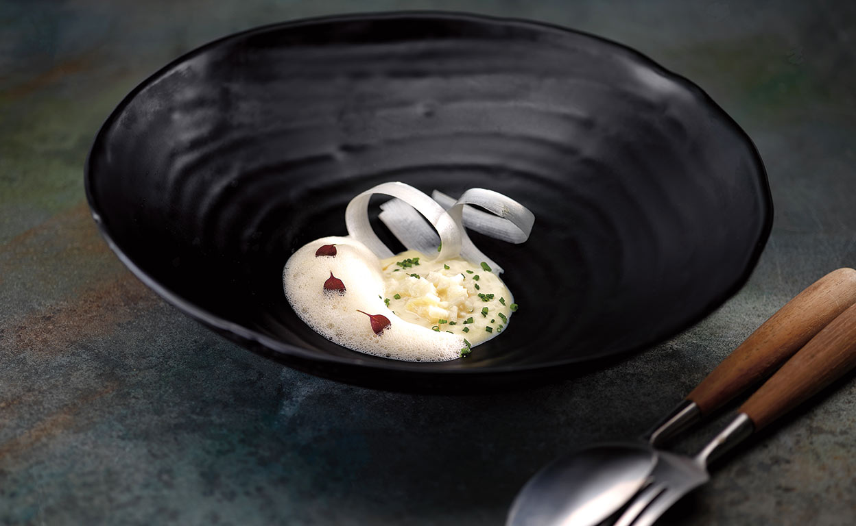 Acabado: aparta otra vez el conjunto del fuego y mantécalo añadiendo el mascarpone, el queso rallado y la cucharada restante de mantequilla, sin dejar de dar vueltas. Echa los dados de espárrago blanco, dale unas vueltas y agrega el cebollino. Acompaña con el jugo espumoso y guarnece con los tallarines. Y listo.