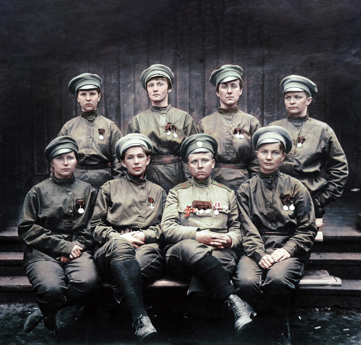 Su bautismo de fuego se produjo durante la batalla de Smarhon, en la actual Bielorrusia, en 1917. En las mangas de sus uniformes llevaban el símbolo alemán de totenkopf ('cabeza de muerto'), que mostraba su deseo de acabar con los odiados prusianos. Durante tres días, 170 mujeres y sus compañeros repelieron 14 ataques de los alemanes, pero tuvieron que retirase al no recibir refuerzos. Al concluir la batalla, 30 mujeres habían perecido y más de 70 resultaron heridas. Todas ellas pertenecían al Batallón de la Muerte, una serie de unidades militares formadas únicamente por mujeres. Con ellas, el Gobierno Provisional Ruso formado tras la Revolución de febrero de 1917 quería estimular el fervor guerrero de los rusos que, hartos del conflicto, rechazaban combatir contra otros proletarios. Eran tiempos de efervescencia bolchevique. A las mujeres las comandaba María Bochkariova (en la imagen anterior, sentada, la segunda por la derecha), una treintañera de origen humilde que había nacido en una familia de campesinos. Su padre, exmilitar, fue un hombre agresivo y alcohólico que obligó a María a sobrevivir como pudo. A los 16 ya se había casado para escapar, pero su primer marido era un borracho que le pegaba y el segundo, un delincuente adicto al juego que también la maltrataba.