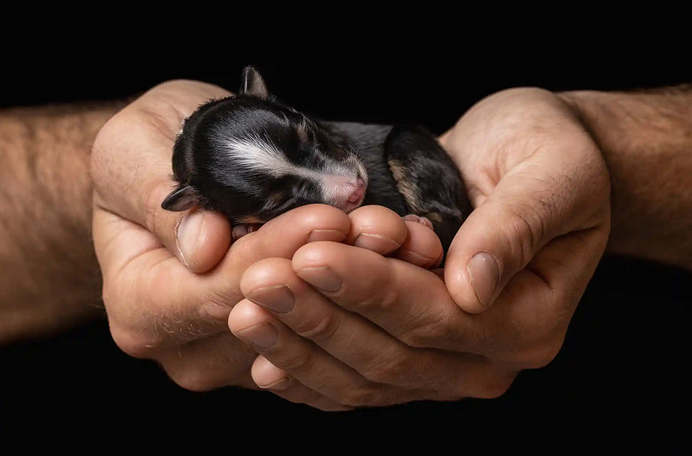 El pequeño milagro en manos de su criador enternece y ni siquiera ha abierto los ojos. Después de años fotografiando perros, Daniela Schmid, la autora de esta imagen, conoce perfectamente la capacidad que tienen para comunicarse con los humanos. Incluso cuando son cachorros. ¿Nacen ya con ese talento? La respuesta a esta característica, única entre todos los animales, también la tiene la ciencia. Revela un estudio de la Universidad de Arizona liderado por la investigadora Emily E. Bray que, desde edades muy tempranas, los cachorros responden a la mirada social humana y utilizan con éxito la información que les proporciona. «Muestran habilidades sociales similares a las de los humanos, que tienen un fuerte componente genético. Por lo tanto, nuestros hallazgos podrían apuntar a una parte importante de la historia de la domesticación, en el sentido de que los animales con una propensión a comunicarse con nuestra propia especie podrían haber sido seleccionados en las poblaciones de lobos que dieron origen a los perros».