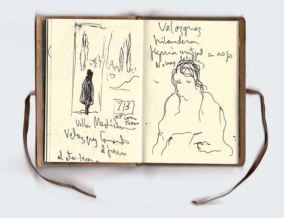 «Por la naturalidad con la que pinta, Velázquez transmite casi una especie de desdén. Ves que huye de algo. Es un pasmo constante. Es el pintor más fascinante de la historia del arte», explica Barceló. Estos son sus bocetos sobre Las hilanderas y la Vista del jardín de la Villa Medici, uno de sus cuadros favoritos.