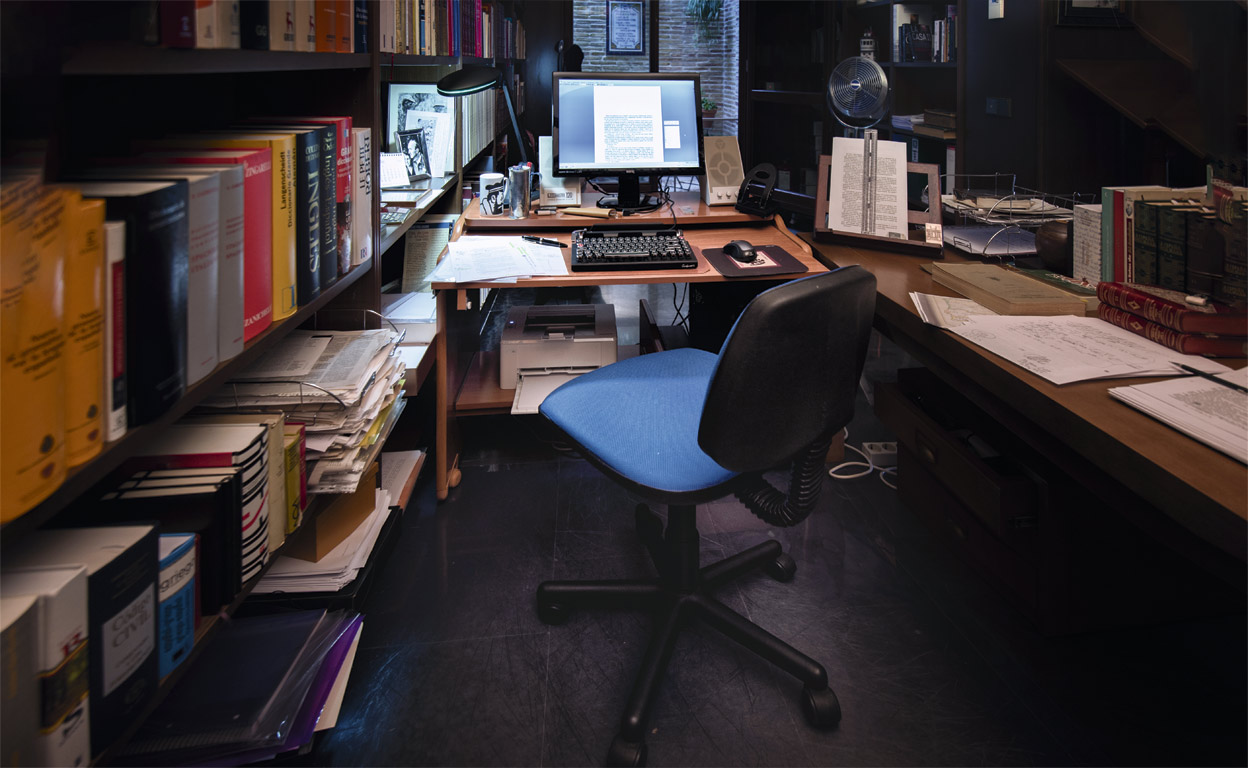 Una foto de sus padres en la misma balda que ocupan diccionarios y obras de referencia. Y cuando el escritor necesita echar mano del saber enciclopédico: la Espasa, la Summa Artis, la Britannica... Nunca la Wikipedia. «Aquí no tengo conexión a Internet, ni teléfono. No quiero distracciones».